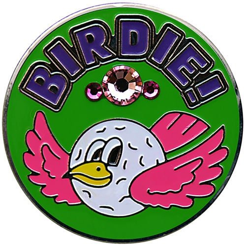 Birdie golf ball markers come in two colors, are 24.5mm round (about the size of a quarter), are made of iron, and plated in nickel. Hand painted with raised metal, these golf ball markers include a matching magnetic hat clip. The hat clip has strong magnet that keeps your ball marker in place until you are ready to remove it. Upgrade to a switchblade divot tool, necklace, divot tool hat clip, or shoe clip for a small additional charge. Wholesale pricing available.