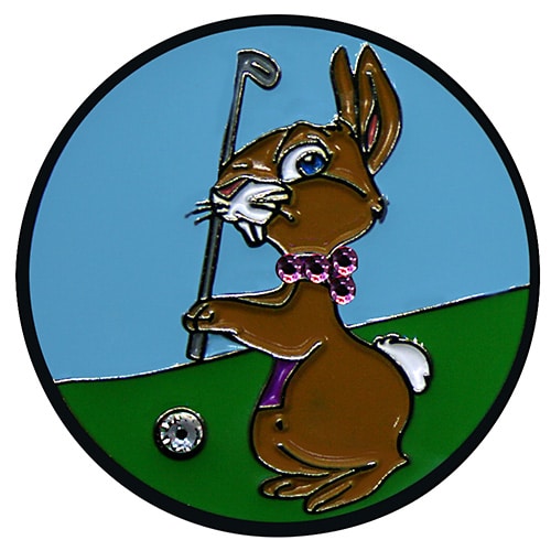 Brown Bunny golf ball marker is 24.5mm round (about the size of a quarter), is made of iron, and plated in black nickel. Hand painted with raised metal, this cute Easter bunny golf ball marker includes a matching magnetic hat clip. The hat clip has a strong magnet that keeps your ball marker in place until you are ready to remove it. Choose with or without Swarovski crystals. Upgrade to a switchblade divot tool, necklace, divot tool hat clip, or shoe clip for a small additional charge. Wholesale pricing available.