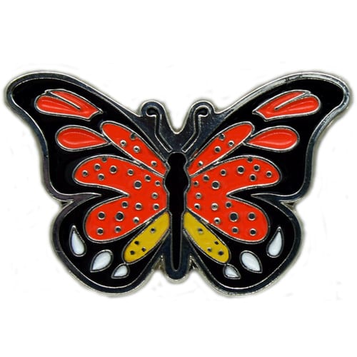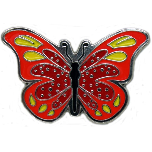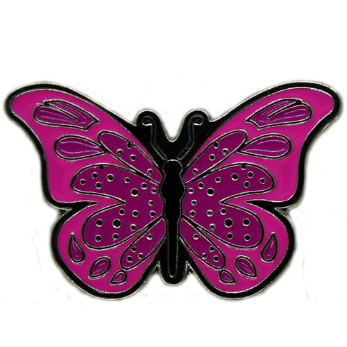 Butterfly ball marker is 27.4mm authentically shaped, is made of iron, and plated in nickel. Hand painted with raised metal, the ball marker comes in a variety of colors.  It is includes a matching magnetic hat clip. The hat clip has a strong magnet that keeps your ball marker in place until you are ready to remove it. Upgrade to a switchblade divot tool, necklace, divot tool hat clip, or shoe clip for a small additional charge. Wholesale pricing available.