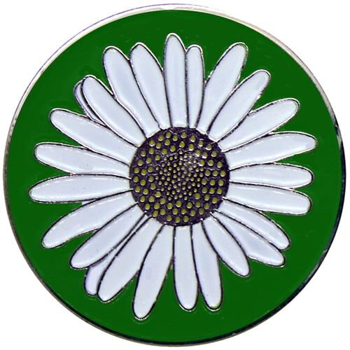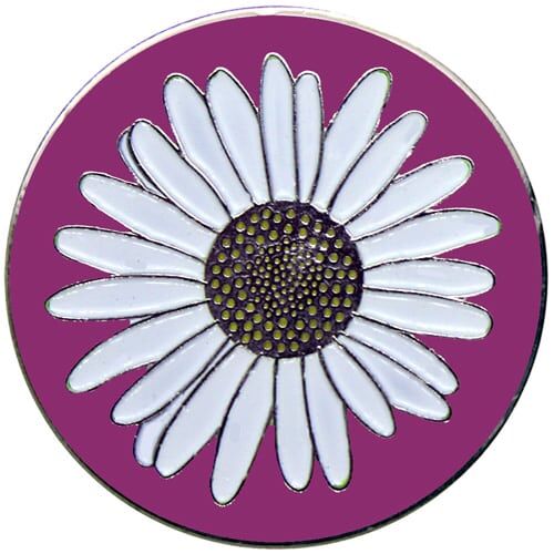 Daisy ball markers are 24.5mm round (about the size of a quarter), made of iron, and plated in nickel. Hand painted with raised metal, the ball marker comes in a variety of background colors. It is includes a matching magnetic hat clip. The hat clip has a strong magnet that keeps your ball marker in place until you are ready to remove it. Choose green, pink, purple, or yellow backgrounds. Upgrade to a switchblade divot tool, necklace, divot tool hat clip, or shoe clip for a small additional charge. Wholesale pricing available.