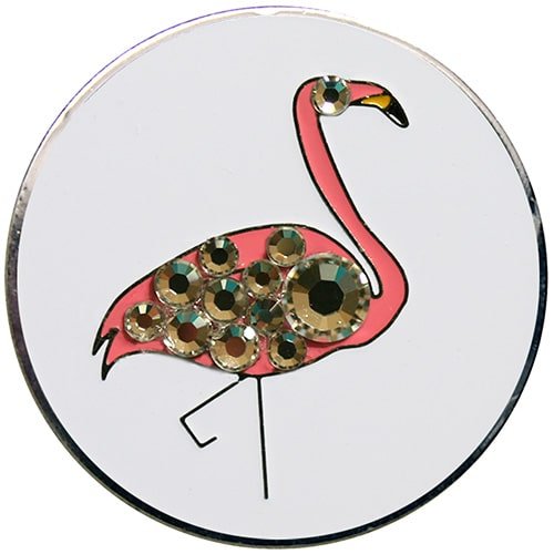 Swarovski Flamingo ball marker is great summer theme for any event. Have fun with this awesome ball marker that is 24.5mm round, is made of iron, and plated in nickel. Hand painted with raised metal, and adorned in beautiful genuine Swarovski crystals, the ball marker includes a matching hat clip. The hat clip has a strong magnet that keeps your ball marker in place until you are ready to remove it. Upgrade to a switchblade divot tool, necklace, divot tool hat clip, or shoe clip for a small additional charge. Wholesale pricing available.