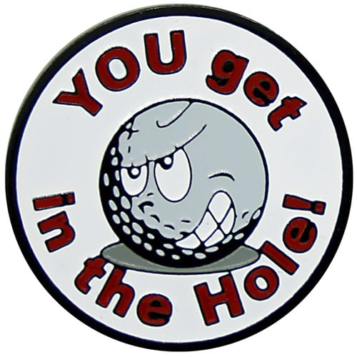 Get in the Hole golf ball marker is 24.5mm round, is made of iron, and plated in black nickel. Hand painted with raised metal, this golf ball marker includes a matching magnetic hat clip. The hat clip has a strong magnet that keeps your ball marker in place until you are ready to remove it. Upgrade to a switchblade divot tool, necklace, divot tool hat clip, or shoe clip for a small additional charge. Wholesale pricing available.