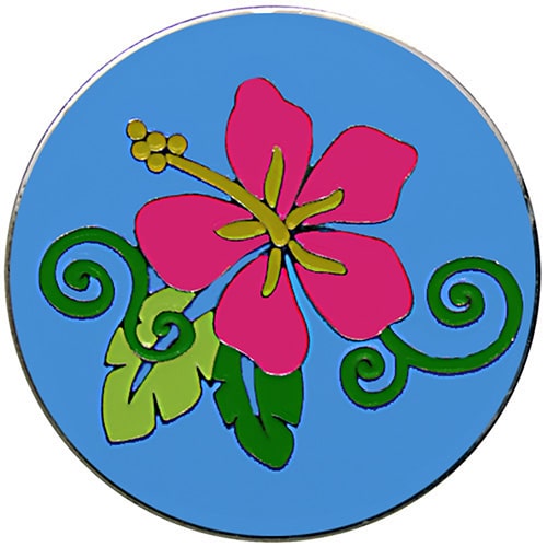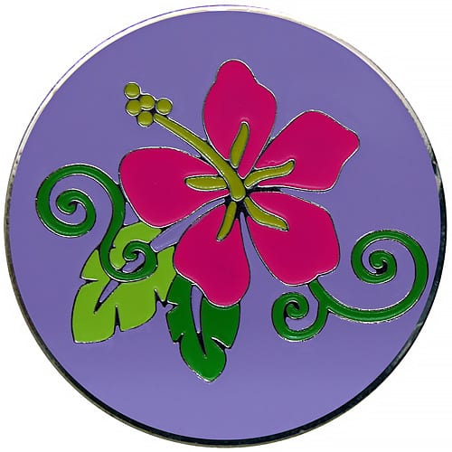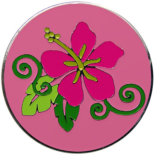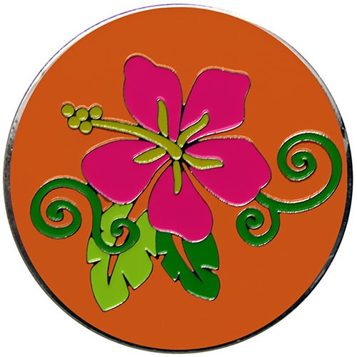 Hibiscus golf ball markers are 24.5mm round (about the size of a quarter), made of iron, and plated in nickel. Hand painted with raised metal, this golf ball marker includes a matching magnetic hat clip. The hat clip has a strong magnet that keeps your ball marker in place until you are ready to remove it. Choose blue, pink, lavender, or orange backgrounds. Upgrade to a switchblade divot tool, necklace, divot tool hat clip, or shoe clip for a small additional charge. Wholesale pricing available.