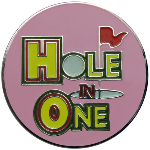 Hole in One golf ball markers come in two colors, are 24.5mm round (about the size of a quarter), are made of iron, and plated in nickel. Our hole in one golf ball markers are hand painted with raised metal, these golf ball markers include a matching magnetic hat clip. The hat clip has strong magnet that keeps your ball marker in place until you are ready to remove it. Upgrade to a switchblade divot tool, necklace, divot tool hat clip, or shoe clip for a small additional charge. Wholesale pricing available.