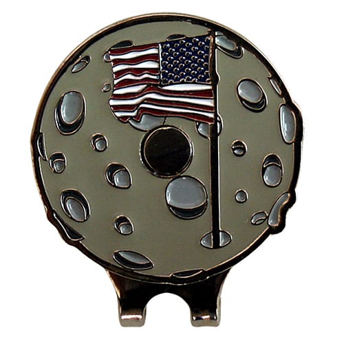Lunar Module golf ball marker is 33mm authentically shaped, is made of iron, and plated in black nickel. Hand painted with raised metal, this awesome golf ball marker includes a message “That’s one small step for man, one giant leap for mankind.” It also includes a matching Lunar magnetic hat clip. The hat clip has a strong magnet that keeps your ball marker in place until you are ready to remove it. Upgrade to a switchblade divot tool, necklace, divot tool hat clip, or shoe clip for a small additional charge. Wholesale pricing available.