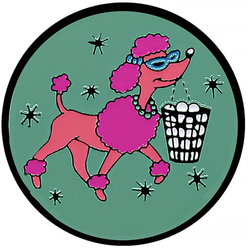 Pink Poodle Range Rover golf ball marker is 24.5mm round (about the size of a quarter), is made of iron, and plated in black nickel. Hand painted with raised metal, this golf ball marker includes a matching magnetic hat clip. The hat clip has strong magnet that keeps your ball marker in place until you are ready to remove it. Upgrade to a switchblade divot tool, necklace, divot tool hat clip, or shoe clip for a small additional charge. Wholesale pricing available.