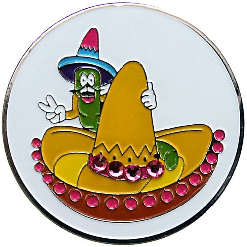 Sombrero golf ball marker is 24.5mm round (about the size of a quarter), is made of iron, and plated in nickel. This cool desert themed golf ball marker has raised metal, is hand painted and includes a matching magnetic hat clip. The hat clip has a strong magnet that keeps your ball marker in place until you are ready to remove it. Choose with or without Swarovski crystals. Upgrade to a switchblade divot tool, necklace, divot tool hat clip, or shoe clip for a small additional charge. Wholesale pricing available.