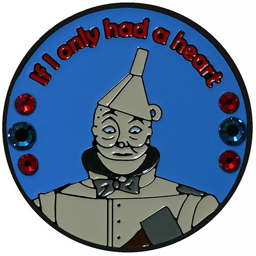 Swarovski Tin Man Ball Marker is a great gift for any avid golfer. This fun Wizard of Oz themed ball marker is 24.5mm round (about the size of a quarter), is made of iron, and plated in black nickel. Hand painted with raised metal, and adorned in beautiful genuine Swarovski crystals, the ball marker includes a matching hat clip. The hat clip has a strong magnet that keeps your ball marker in place until you are ready to remove it. Upgrade to a switchblade divot tool, necklace, divot tool hat clip, or shoe clip for a small additional charge. Wholesale pricing available.