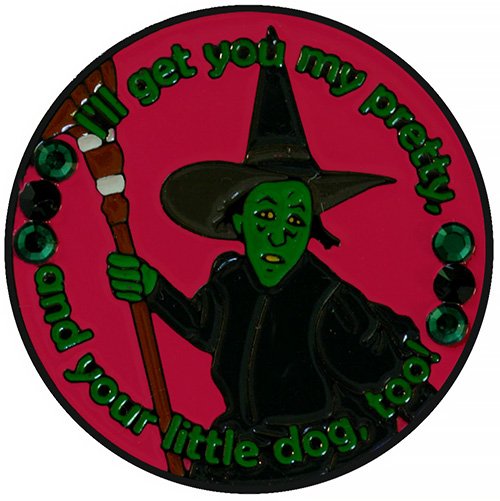 Swarovski Wicked Witch Ball Marker is a great gift for any avid golfer. This fun Wizard of Oz themed ball marker is 24.5mm round (about the size of a quarter), is made of iron, and plated in black nickel. Hand painted with raised metal, and adorned in beautiful genuine Swarovski crystals, the ball marker includes a matching hat clip. The hat clip has a strong magnet that keeps your ball marker in place until you are ready to remove it. Upgrade to a switchblade divot tool, necklace, divot tool hat clip, or shoe clip for a small additional charge. Wholesale pricing available.