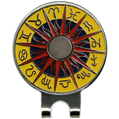 Swing with the Stars Zodiac golf ball marker is 24.5mm round (about the size of a quarter), made of iron, and plated in nickel. Hand painted with raised metal, it  includes a matching magnetic hat clip. The hat clip has a strong magnet that keeps your ball marker in place until you are ready to remove it. Upgrade to a switchblade divot tool, necklace, divot tool hat clip, or shoe clip for a small additional charge. Wholesale pricing available.