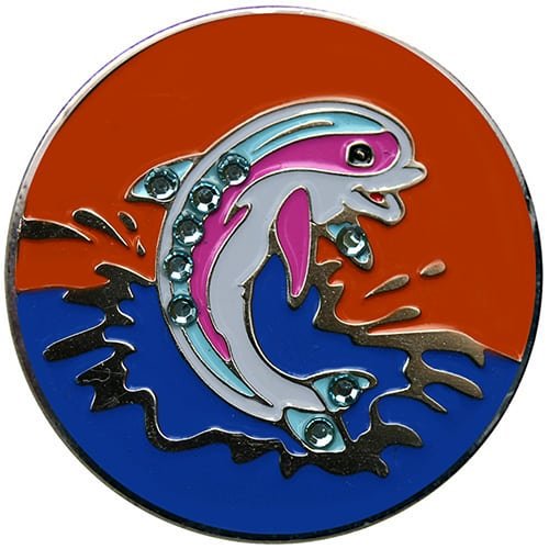 Dolphin Sunset golf ball marker is 24.5mm round (about the size of a quarter), is made of iron, and plated in nickel. Hand painted with raised metal, this golf ball marker includes a matching magnetic hat clip. The hat clip has a strong magnet that keeps your ball marker in place until you are ready to remove it. Upgrade to a switchblade divot tool, necklace, divot tool hat clip, or shoe clip for a small additional charge. Wholesale pricing available.