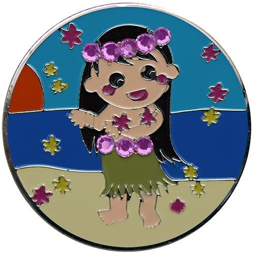 Hula Girl golf ball marker is 24.5mm round (about the size of a quarter), is made of iron, and plated in nickel. Hand painted with raised metal, this golf ball marker includes a matching magnetic hat clip. The hat clip has a strong magnet that keeps your ball marker in place until you are ready to remove it. Choose with or without genuine Swarovski crystals. Upgrade to a switchblade divot tool, necklace, divot tool hat clip, or shoe clip for a small additional charge. Wholesale pricing available.