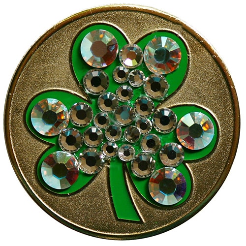 Shamrock golf ball marker is 24.5mm round (about the size of a quarter), is made of iron, plated in gold, and sandblasted. Hand painted with raised metal, this lucky Shamrock golf ball marker includes a matching magnetic hat clip. The hat clip has strong magnet that keeps your ball marker in place until you are ready to remove it. Select with or without Swarovski crystals. Upgrade to a switchblade divot tool, necklace, divot tool hat clip, or shoe clip for a small additional charge. Wholesale pricing available.