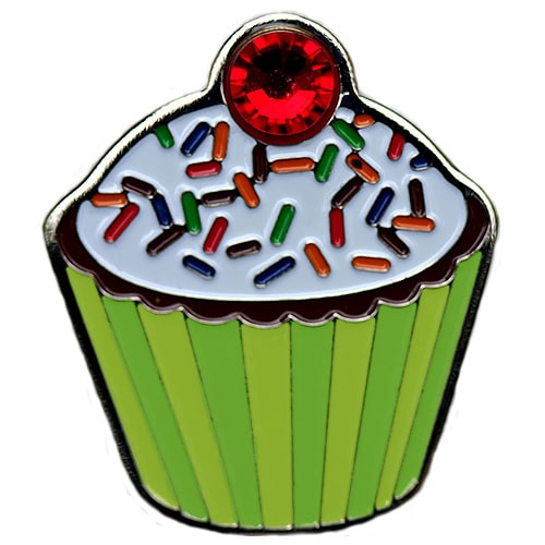 Mocha Latte Cupcake ball marker is approximately 24.5mm, is made of iron, and plated in nickel. Hand painted with raised metal, this authentically shaped golf ball marker includes a matching magnetic hat clip. The hat clip has strong magnet that keeps your ball marker in place until you are ready to remove it. Add beautiful Swarovski crystals for a minimum charge. Choose to upgrade to a switchblade divot tool, necklace, divot tool hat clip, or shoe clip for a small additional charge. Wholesale pricing available.