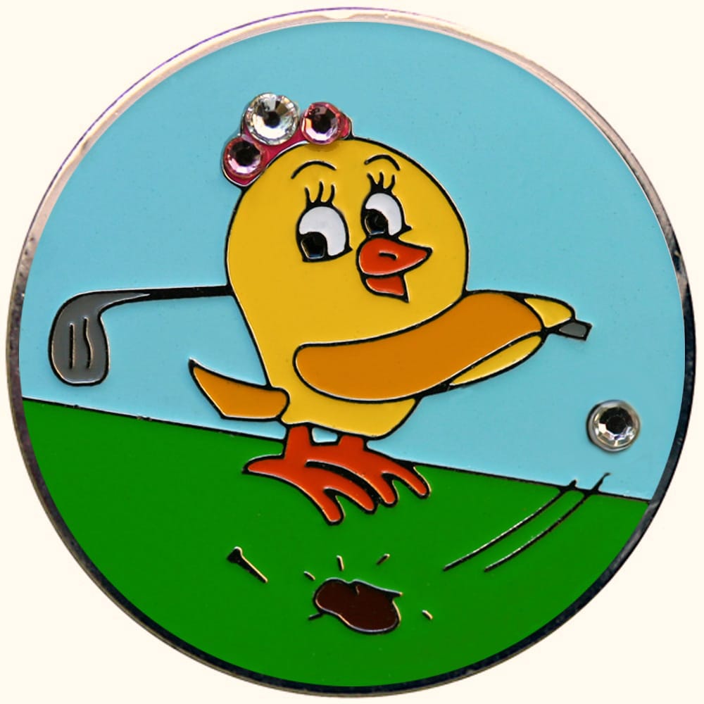 Yellow Birdie golf ball markers come are 24.5mm round (about the size of a quarter), are made of iron, and plated in nickel. Hand painted with raised metal, these golf ball markers include a matching magnetic hat clip. The hat clip has strong magnet that keeps your ball marker in place until you are ready to remove it. As an option, choose beautiful Swarovski crystals. Upgrade to a switchblade divot tool, necklace, divot tool hat clip, or shoe clip for a small additional charge. Wholesale pricing available.