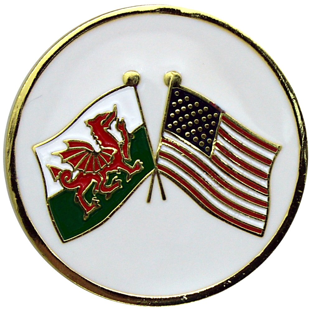 Welsh-USA flags golf ball marker is 24.5mm round (about the size of a quarter), is made of iron, and plated in gold. Hand painted with raised metal, this golf ball marker includes a matching magnetic hat clip. The hat clip has a strong magnet that keeps your ball marker in place until you are ready to remove it. Upgrade to a switchblade divot tool, necklace, divot tool hat clip, or shoe clip for a small additional charge. Wholesale pricing available.